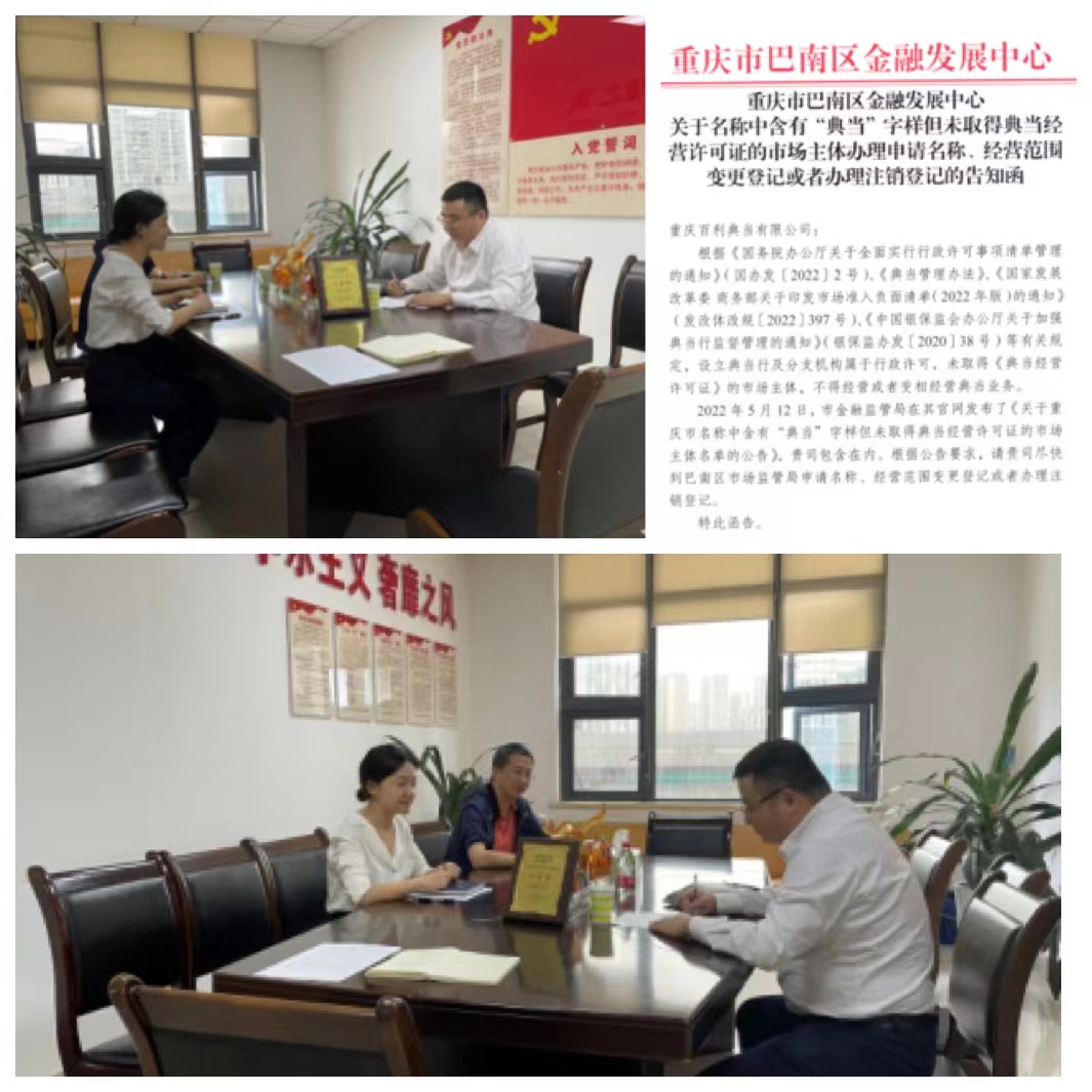 巴南区金融发展中心会同区市场监管局对辖区内4家“证照不齐”机构进行了排查清理,通过约谈、函告等方式,督促机构尽快办理变更或注销登记。在此基础上,将“证照不齐”典当行名单上传至“巴巴实”平台,及时向平台注册的1万余家企业及个人发布金融风险警示,提醒辖区企业和个人在选择典当服务时,注意甄别典当行经营资质以有效维护自身合法权益,敦促证照不齐典当行在取得有效证照前不得开展典当业务,坚决杜绝证照不齐典当行违规展业等行业乱象演变为区域金融风险,为辖区典当行业平稳健康发展保驾护航。